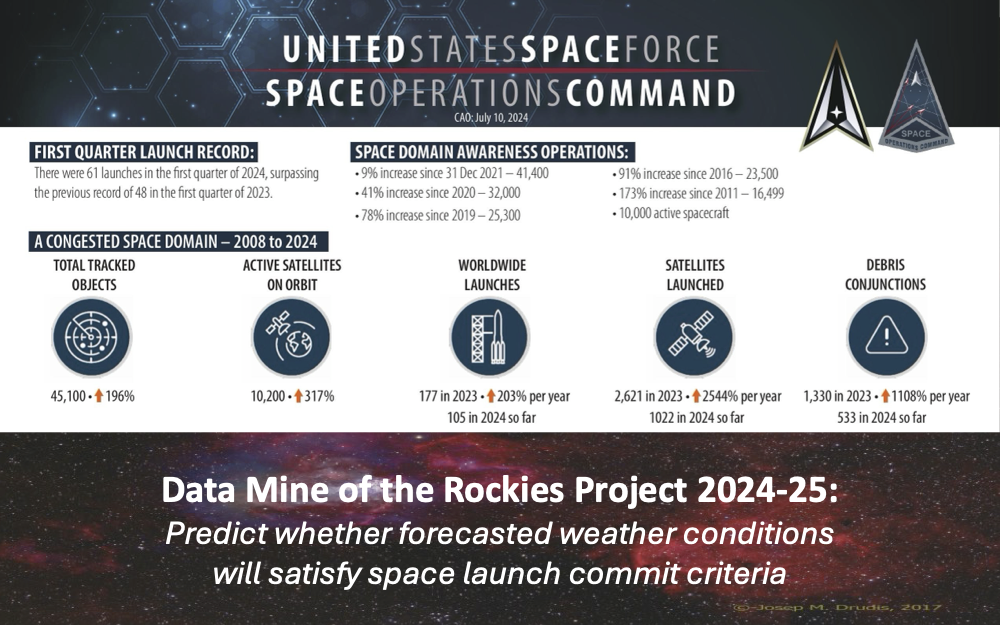SpOC: Launch Commit Criteria This DMR project with the U.S. Space Force’s Space Operations Command explores how machine learning models can predict whether a space launch will be a “go” or “no-go” based on weather forecasts. Students worked with real data from Cape Canaveral and Vandenberg to train deep learning and boosting models, helping defense operators better assess launch feasibility—both for U.S. missions and potential adversaries.