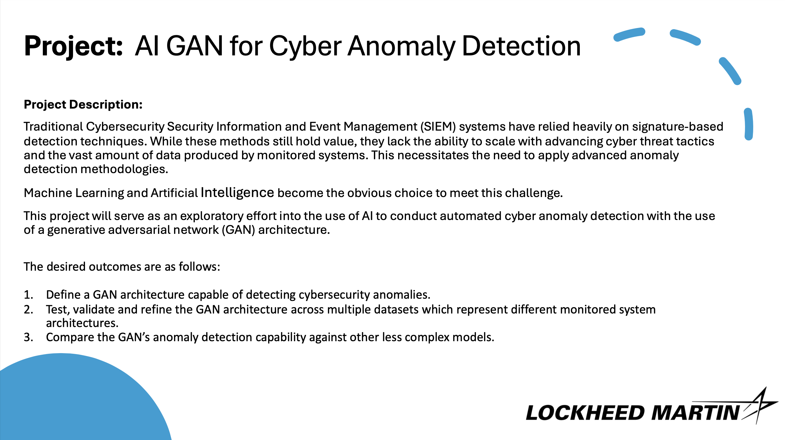 Lockheed Martin: Anomaly Detection in System Logs Using GANs In this project, students partnered with Lockheed Martin to explore how machine learning can detect anomalies in massive system log data. By comparing Generative Adversarial Networks (GANs) with LSTM-based autoencoders, the team investigated new ways to identify hidden cyber threats and unusual behavior in complex networks. This hands-on work advanced real-world cybersecurity strategies and gave students a chance to work at the cutting edge of AI and defense technology.